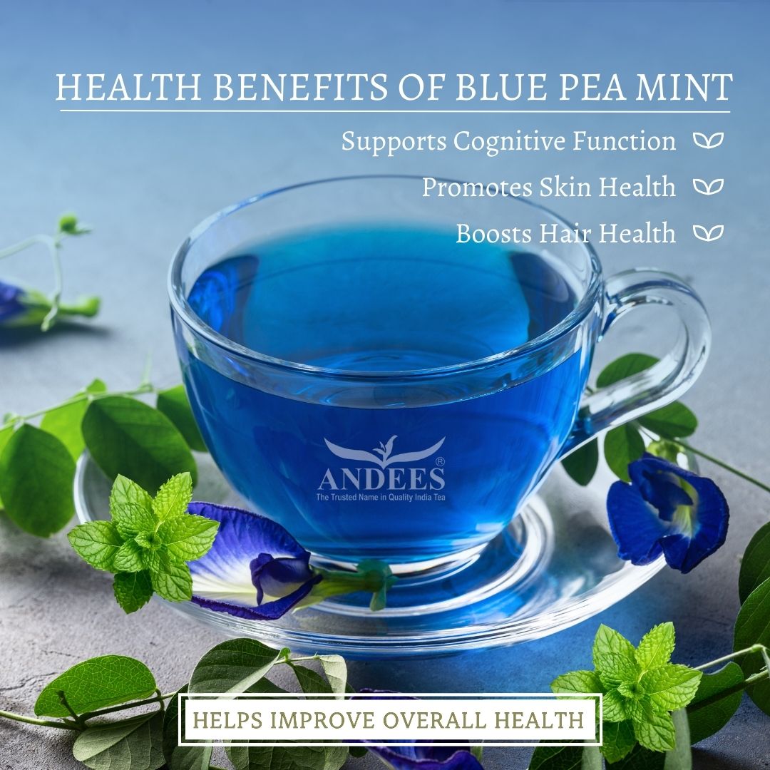 Blue Pea Mint Tea: Rich in antioxidants, promotes glowing skin and reduces inflammation.