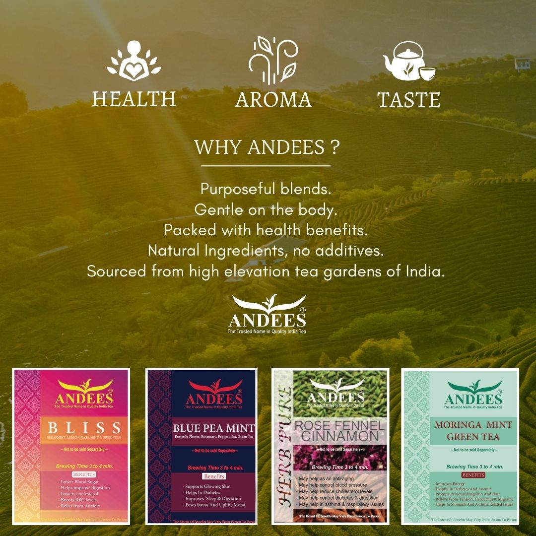 Innovative Blends: At Andees, we go beyond tradition. From exotic blends like Blue Pea Mint and Moringa Mint Green Tea to classic favorites like Masala Chai, we innovate with flavor, wellness benefits, and sustainability. Chakra blending is just one example of our approach to redefining tea with health at the forefront.